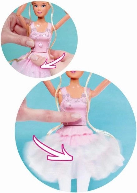 Objavte čaro baletu s bábikou Lalka Steffi Love – tancujúca balerína. Má otáčajúcu sa tylovú sukničku na tlačidlo v tvare ruže, pohyblivé ruky v lakťoch aj zápästiach pre ladné pózy a v balení nájdete aj roztomilého králika v sukničke. Ideálne pre kreatívnu hru a milovníčky tanca.