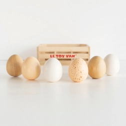 Drevené farmárske vajcia v debničke od LE TOY VAN sú perfektným doplnkom do detskej kuchynky aj obchodíka. Set 6 realistických vajec z pevného kaučukového dreva v praktickej debničke s úchytmi podporuje predstavivú hru, rozvíja jemnú motoriku a učí deti o zdravom stravovaní. Vyrobené z udržateľných materiálov a maľované netoxickými farbami na vodnej báze.