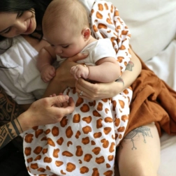 Vďaka veľkorysným rozmerom 120 × 120 cm je ideálna na zavinovanie, zakrytie aj každodennú starostlivosť doma i na cestách. Štýlový motív biely leopard poteší rodičov, ktorí hľadajú praktický doplnok s moderným dizajnom.