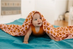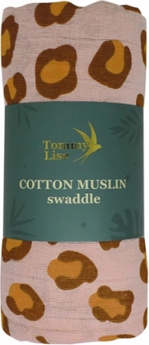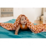 Veľkorysý rozmer 120 × 120 cm ponúka desiatky použití: od zavinutia, cez prikrytie v kočíku, až po podbradník či podložku. Štýlová potlač leoparda v koralových tónoch poteší oko a krásne ladí s detskou izbičkou aj výbavou na cesty.