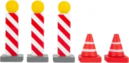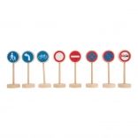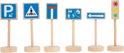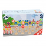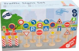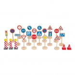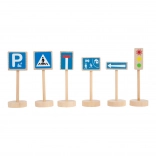 Sada 25 drevených dopravných značiek a doplnkov (napr. kužele) pomáha deťom pochopiť pravidlá cestnej premávky v realistických herných scenároch. Vďaka čitateľným symbolom a stabilným podstavcom sa s nimi dobre manipuluje a sú skvelým doplnkom k dopravným kobercom aj vláčikodráham.