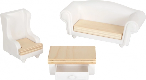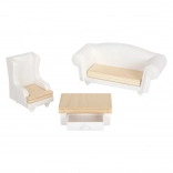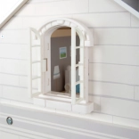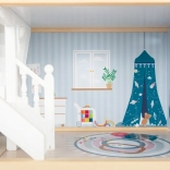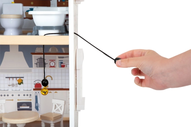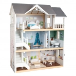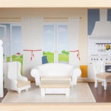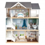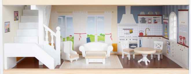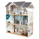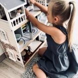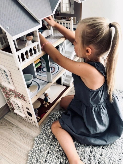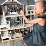Domček pre bábiky má svetlú vonkajšiu fasádu, moderný dizajn a funkčné prvky ako posuvné dvere a otvárateľné okná.