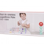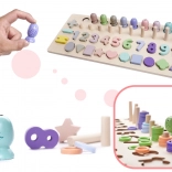 Na pevnej drevenej základni sa nachádzajú výrezy pre číslice a tvary, desať kolíkov na stohovanie farebných krúžkov a rybárska minihra s drevenými rybkami a magnetickou udicou. Každý kolík zodpovedá danej číslici – dieťa tak prirodzene chápe vzťah medzi číslom a množstvom.