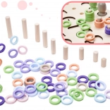 Desať kolíkov a sada farebných krúžkov pomáha pochopiť princíp množstva. Počet krúžkov na kolíku zodpovedá číslici na doske – jednoduché a názorné učenie prvého počítania.