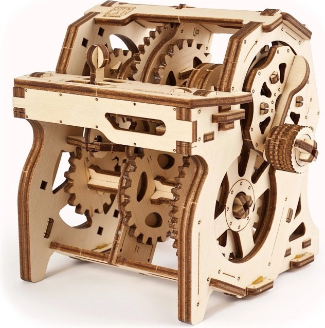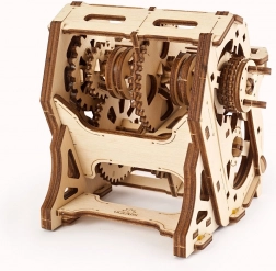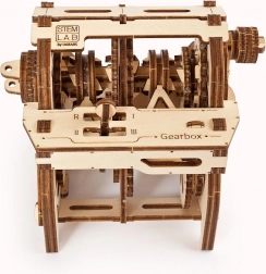 Zloženie modelu štvorrýchlostnej prevodovky odhaľuje chod mechaniky, kde sa demonštruje radenie rýchlostných stupňov, spiatočky a voľnobehu. Model je vyrobený z preglejky a ponúka interaktívne vzdelávanie vďaka rozšírenej realite cez aplikáciu UGEARS. Zážitok prehlbuje QR kód, ktorý spojíte so svojím mobilným telefónom.