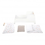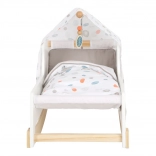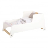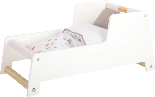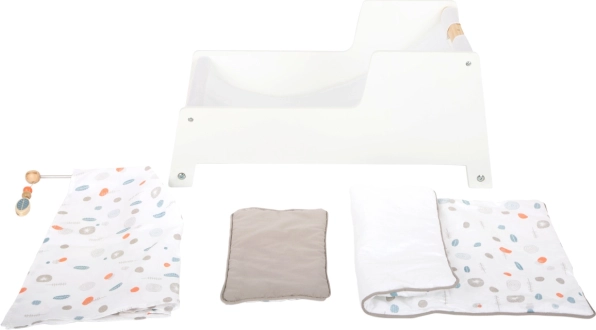 Súčasťou sú obojstranné, neutrálne ladené obliečky a veľká prikrývka, pod ktorou sa pohodlne zmestia bábiky či plyšáci do 46 cm. Jemné farby a minimalistické línie z nej robia vkusný doplnok do každého interiéru a podporujú kreatívnu a napodobňovaciu hru.