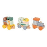 Drevený vláčik Safari je ilustrovaný v pastelových farbách s motívmi safari zvierat, čo činí hračku vizuálne atraktívnou pre malé deti.