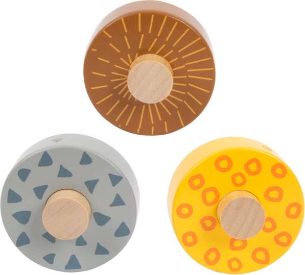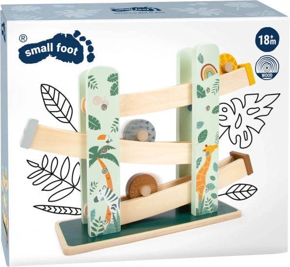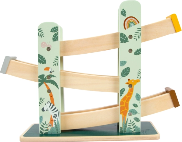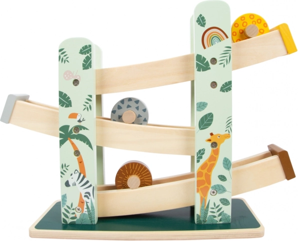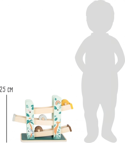 Táto krásna drevená dráha ponúka deťom možnosť sledovať, ako tri kolieska, každé s unikátnym dizajnom, schádzajú dole po troch rampách. Je dekorovaná ilustráciami zvierat žijúcich na safari a rastlín z džungle.