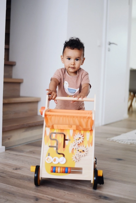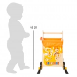 Toto chodítko má pestrý dizajn a ponúka rôzne aktivity na troch stranách, vrátane vkladačky, počítadla a posuvného labyrintu. Predné kolesá sú vybavené "nožičkami", ktoré pri pohybe vydávajú zábavný zvuk, čo pridáva na zábave. Praktickým doplnkom je aj úložný kôš, ktorý je ľahko údržiavateľný.