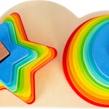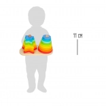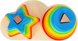 Navliekacia veža Dúha Duo je drevená hračka navrhnutá na podporu učenia a rozvoja detí. Ponúka možnosť zoradiť diely podľa veľkosti a tvaru - hviezdičiek a kruhov - v žiarivo farebnom prevedení. Táto hračka stimuluje rozpozorovanie farieb a koordinačné schopnosti, zatiaľ čo deti zábavne stavajú dúhu.