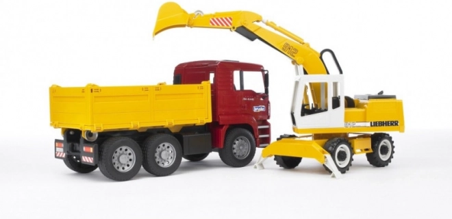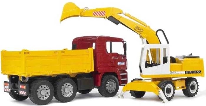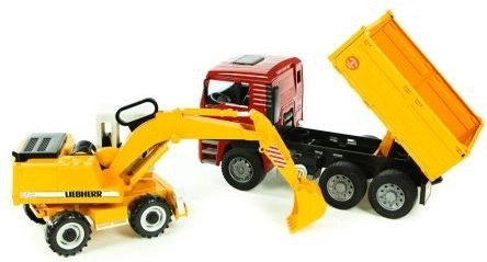 Táto úžasná stavebná sada od firmy Bruder zahŕňa nákladný voz MAN TGA s mäkkými pneumatikami a praktickou sklopnou korbou. Spolu s ním nájdete funkčný bager Liebherr, ktorý sa pýši stabilizačnými opornými nohami, profilovanými pneumatikami a rýpadlom s otočnou kabínou o 360°. Výrobok je kvalitne spracovaný v Nemecku z odolných materiálov.