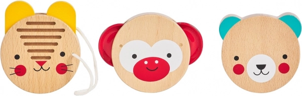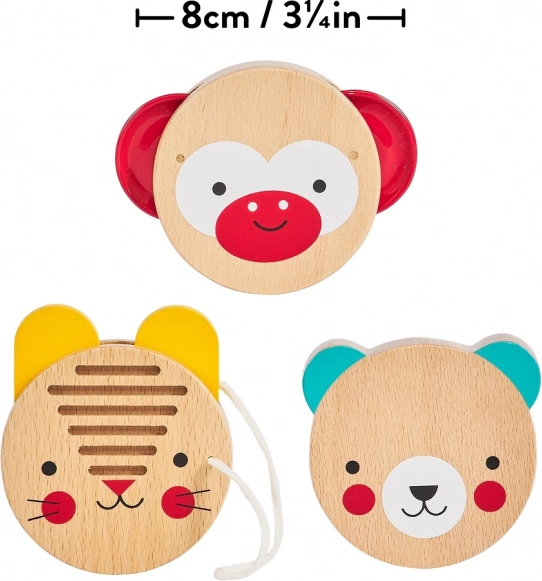 Tri jednoduché perkusné nástroje s motívmi zvieratiek podporujú prirodzené vnímanie rytmu a radosť z hudobnej hry už od ranného veku.