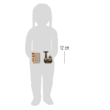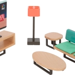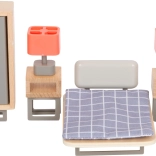 Set zahŕňa chladničku, kuchynskú linku so sporákom a digestorom, jedálenský stôl a stoličky, gauč, konferenčný stolík, nočné stolíky s lampami, posteľ a šatníkovú skriňu, ďalej vaňu, sprchový kút, umývadlo so zrkadlom a toaletu. Nechýbajú ani drobné doplnky pre realistickejšie hry. Perfektná voľba pre rodičov, ktorí hľadajú štýlové, odolné a bezpečné drevené hračky podporujúce rolové hry a jemnú motoriku.