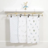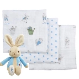 Krásna darčeková sada obsahuje 3 ks mušelínových plienok a plyšového zajaca Petra. Plienky sú vyrobené zo 100% bavlny, prateľné a každá má iný potlač.