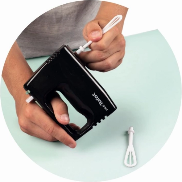 Mini šľahač Tefal Express je ideálny doplnok do každej detskej kuchynskej sady. Metličky sa mechanicky otáčajú stlačením tlačidla a nevyžadujú žiadne batérie.
