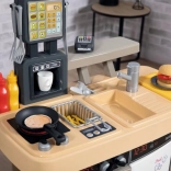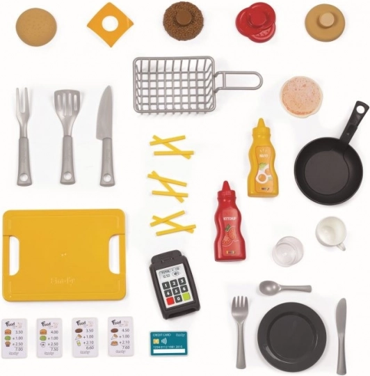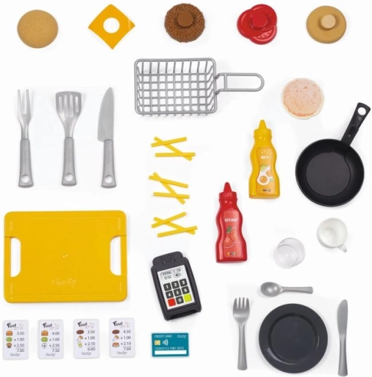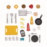 Set zaujme množstvom detailov: platňa, fritéza, drez s kohútikom, rúra, chladnička, dávkovač nápojov, kávovar a závesné háčiky na náradie. Nechýba platobný terminál, bloky, kreditná karta ani vytlačené menu. Po hre možno zvyšky „upratať“ do koša. Celkovo 29 doplnkov podporuje bohaté role-play scenáre a jemnú motoriku.