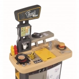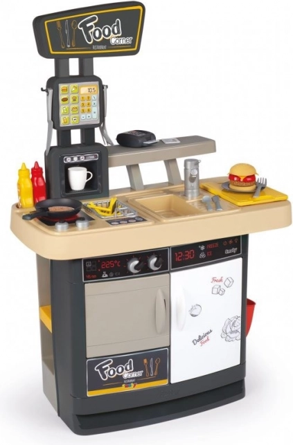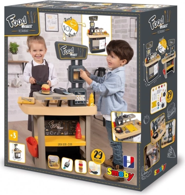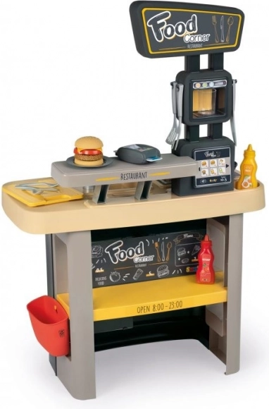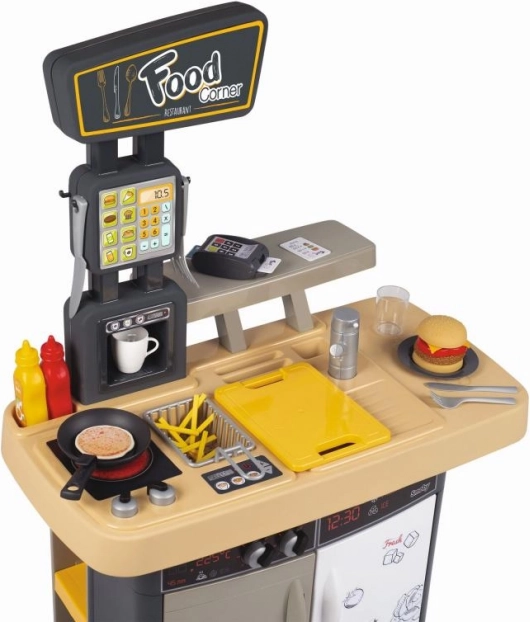 Otvorte si vlastný malý fast food! Detský Food Corner 2v1 od značky Smoby kombinuje kuchynku a výdajným pultom s pokladňou. Deti môžu pripravovať burgre, hranolky či palacinky a zároveň obsluhovať zákazníkov pri pulte – presne ako v skutočnej reštaurácii.