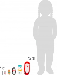 Roztomilá sada drevených matriošiek s motívmi Santu, snehuliaka, tučniaka, soba a medveďa prinesie do domova vianočnú atmosféru. Deti si užijú zábavné vkladanie a skladanie, ktoré rozvíja jemnú motoriku a koordináciu ruka–oko. Ideálna vianočná dekorácia aj darček pre deti od 3 rokov.