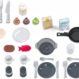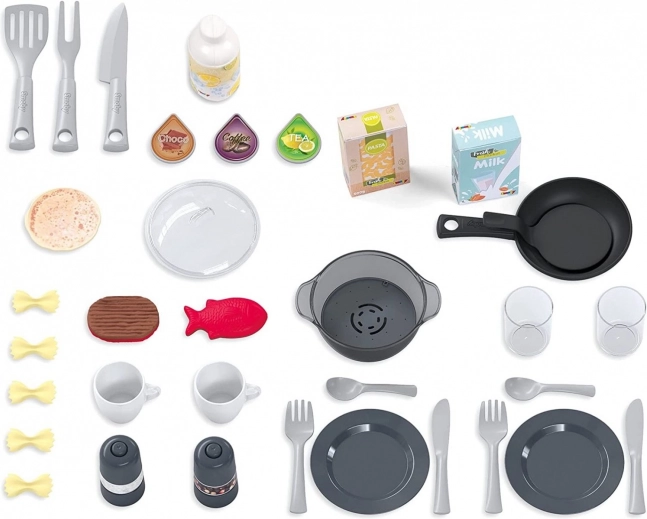 Súčasťou je bohatá sada 34 kusov príslušenstva – hrniec s pokrievkou, panvica na lievance, mlynček na soľ a korenie, riad a príbory pre dve osoby, kapsuly do kávovaru, kuchynské náradie, organizér do umývačky aj napodobeniny potravín. Otočné ovládacie kolieska, otváracie dvierka rúry a chladničky a typický zvuk „cric cric“ pri výrobníku sódy podporujú realistickú hru.