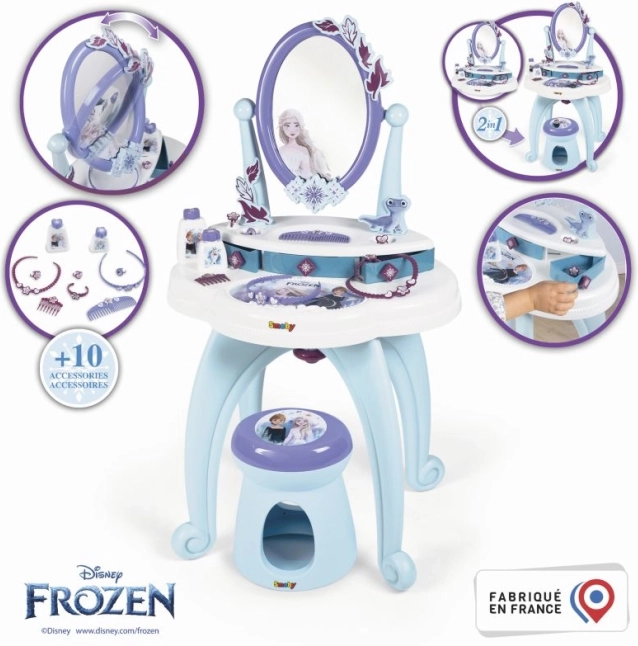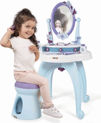 Ponorte sa do kúzelného sveta Ľadového kráľovstva s týmto štýlovým toaletným stolíkom 2v1. Nádherný dizajn vo farbách Elsy a Anny z Ľadového kráľovstva premení každú miestnosť na palácovú komnatu.
