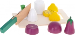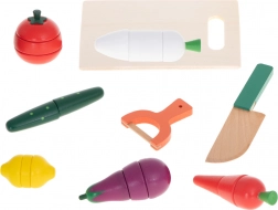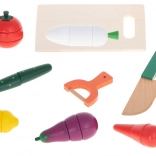 Táto drevená magnetická sada do detskej kuchynky prináša realistické krájanie a šúpanie bez nebezpečenstva. Zeleninu rozdelíte bezpečným nožom, položíte na lopárik a po hre ju vďaka magnetom ľahko spojíte späť. Deti si tak hravou formou fixujú zdravé návyky a pochopia aj princíp magnetického spájania.