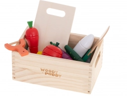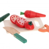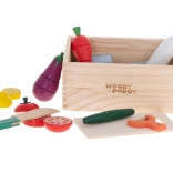 - mrkva, petržlen (reďkovka), uhorka, paradajka (vrátane plátkov), citrón, baklažán, lopárik, bezpečný nôž, bezpečná škrabka, drevená debnička