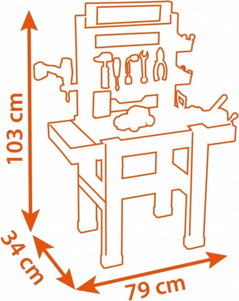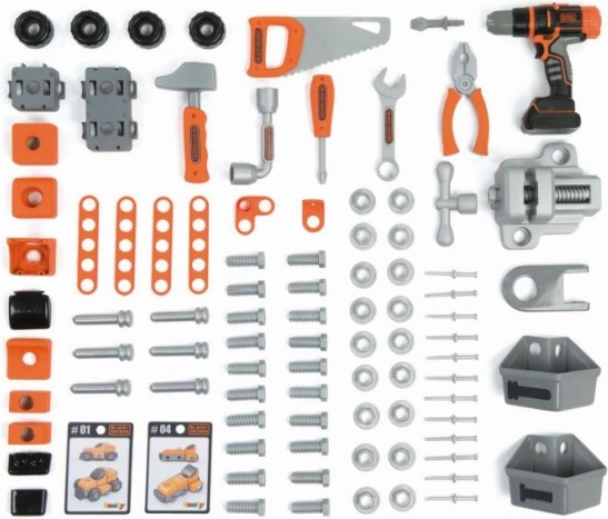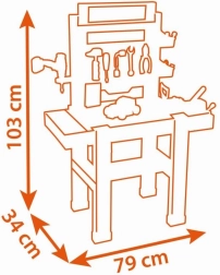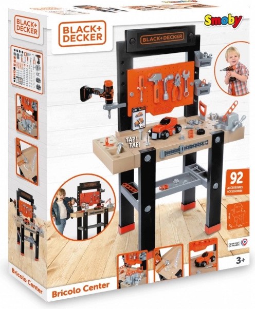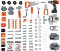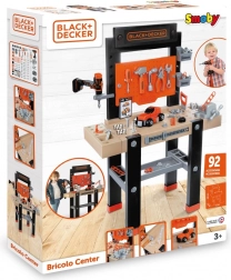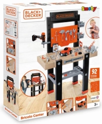 Veľký detský pracovný ponk BLACK+DECKER Bricolo Center od značky Smoby prináša realistickú dielňu s 92 doplnkami. Nájdete v ňom mechanickú vŕtačku, zverák, skrutkovače, kladivo, pílku, kliešte aj autíčko na zostavenie. Stabilná konštrukcia, praktické úložné priestory a rozmery 103 × 79 × 34 cm podporujú rozvoj motoriky a kreativity detí od 3 rokov.