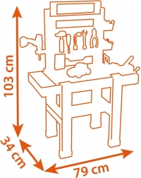 Tento licencovaný ponk BLACK+DECKER od francúzskeho výrobcu Smoby ponúka deťom autentický zážitok z dielne. Vďaka bohatej výbave, perforovanej nástenke na náradie, pevnému zveráku a dvom bočným krídlam s košmi majú malí kutili všetko na dosah a po ruke. Dielňa motivuje k učeniu hrou – deti môžu skrutkovať, zatĺkať, merať a stavať vlastné modely.