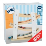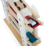 Táto krásna drevená závodná dráha je ideálna pre malých motoristov. Vďaka štyrom autám, ktoré sa môžu strmhlav spustiť smerom nadol po rampe, je hra plná dynamiky a zábavy. Vyrobené z kvalitného prírodného dreva v kombinácii s farebnými akcentmi, ponúka estetický vzhľad a zároveň podporuje rozvoj motoriky detí.