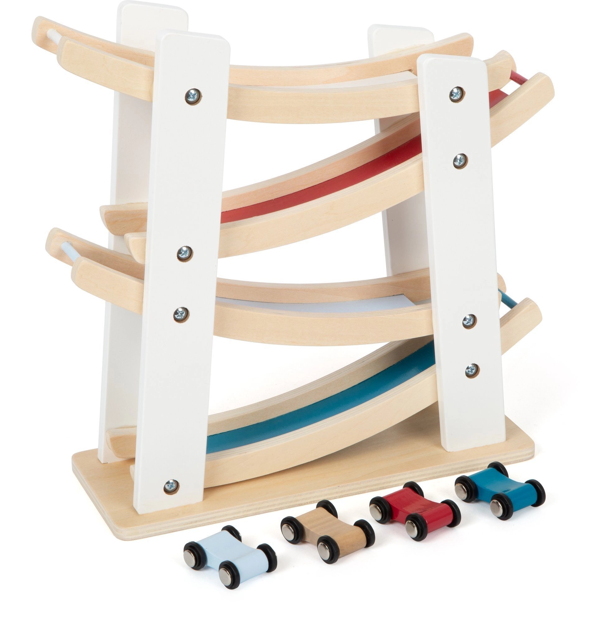 Táto kvalitná drevená dráha ponúka jednoduchý princíp, ktorý deti milujú: položte autíčko na horné poschodie a sledujte, ako svižne kĺže po krivkách až dole. Stabilná základňa a hladké povrchy zaručujú bezpečné a dlhodobé používanie.