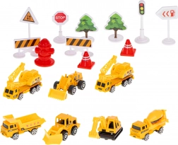 Súčasťou je bager, miešačka, buldozér, sklápač, žeriav a ďalšie vozidlá, doplnené značkami, kužeľmi a stromčekmi na tvorbu vlastných stavenísk.