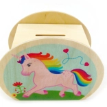 Táto farebná pokladnička s jednorožcom motivuje deti k finančnej gramotnosti a učeniu sa hodnote peňazí. Robustné spracovanie z prírodného dreva zaručuje dlhú životnosť a príjemný prírodný vzhľad, ktorý krásne zapadne do detskej izby.