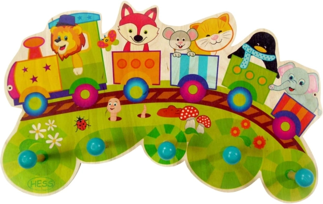 Pútavý farebný vešiak do detskej izby či chodby s motívom vlaku a piatimi háčikmi na zavesenie odevov. Vyrobený z ekologicky šetrného dreva, použité ekologické farby.