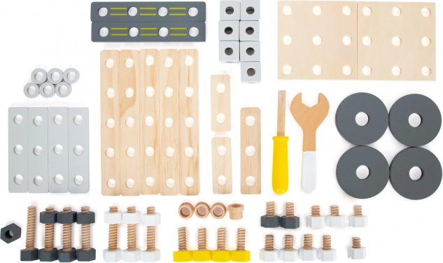 Súčasťou balenia je bohaté príslušenstvo: konštrukčné lišty a dosky s predvŕtanými otvormi, kocky, kolesá, adaptéry kolies, dištančné puzdrá a dva drevené nástroje – kľúč a skrutkovač. Všetko prehľadne uložíte do praktického boxu, takže sa žiadny dielik nestratí.