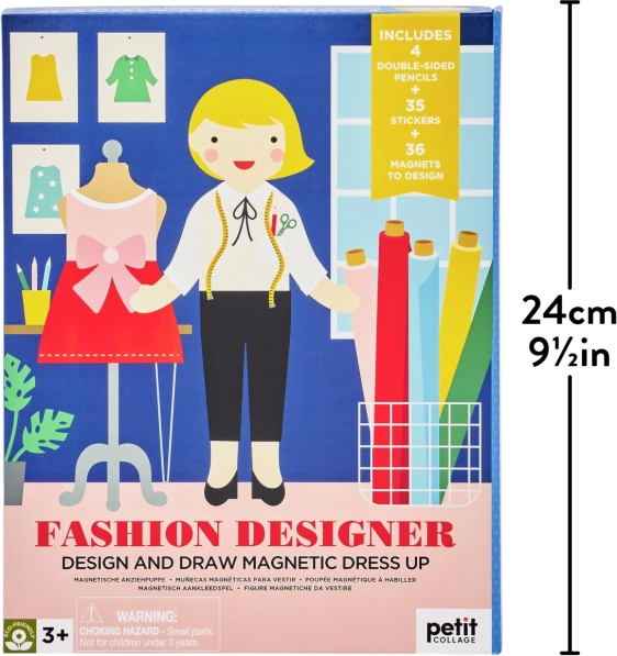 Hračka obsahuje magnetickú figúrku s dreveným stojanom, 36 magnetických dielikov oblečenia, 4 obojstranné pastelky a 35 nálepiek, čo umožňuje vytvorenie viac než 100 rôznych outfitov. Deti môžu vyjadriť svoju kreativitu a rozvíjať svoju predstavivosť vďaka rôznorodosti dielikov a možnostiam kombinovania. Krabička slúži nielen ako úložný priestor, ale tiež ako príjemné pozadie pre hru, čo spôsobuje, že celý zážitok je komplexný a estetický.