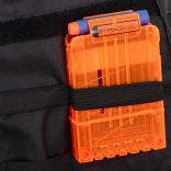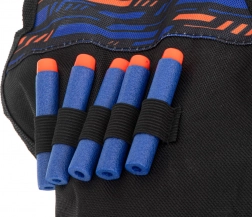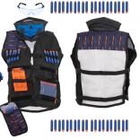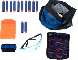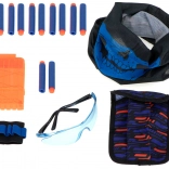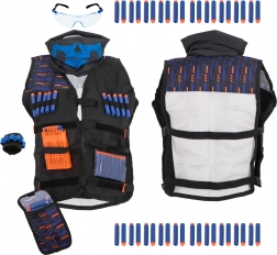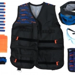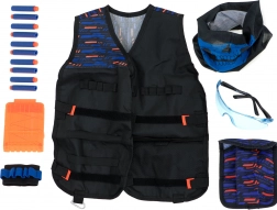 V balení nájdete: 1: taktickú vestu pre malého bojovníka, 40x penové šípy, zásobník na 6 šípov, náramok na zápästie, okuliare, bandáž na tvár s potlačou, puzdro na časopis alebo telefón