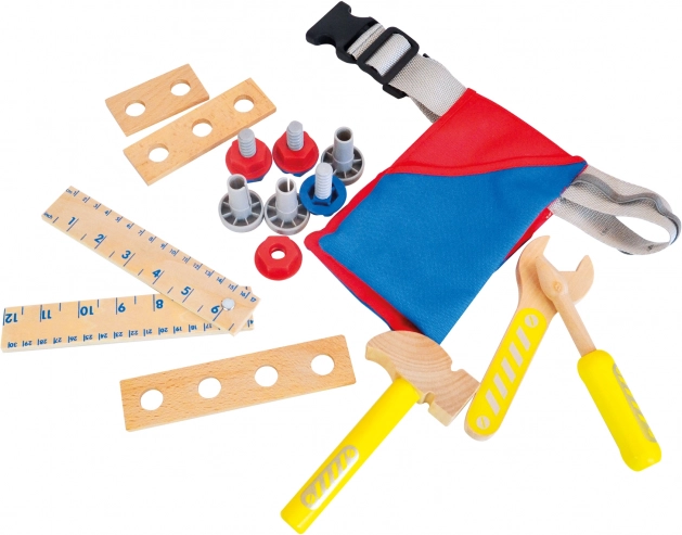 Textilný opasok s praktickými vreckami pojme všetky nástroje – od kladiva a kľúča po skrutkovač, skrutky a matice. Dĺžku ľahko prispôsobíte postave dieťaťa.
