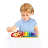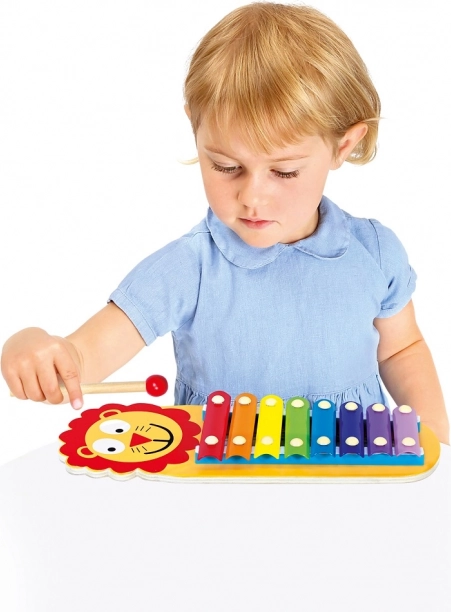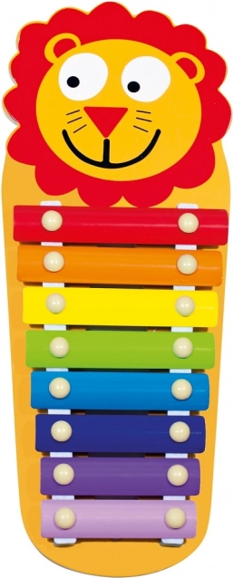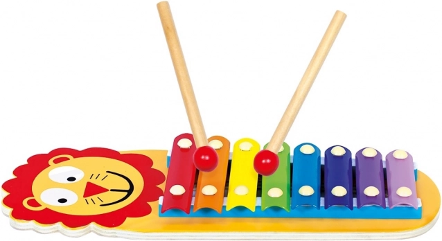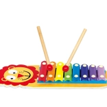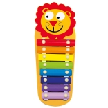 Detský xylofón s veselým motívom levíčika prináša zábavné učenie aj kreatívne hranie. Osem farebných kovových plieškov na drevenom základe znie jasne a príjemne, takže deti ľahko objavujú tóny, rytmus aj prvé melódie. Súčasťou balenia sú dve drevené paličky na pohodlné hranie oboma rukami.