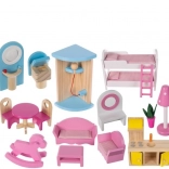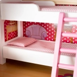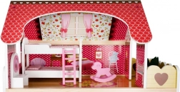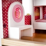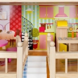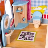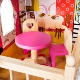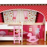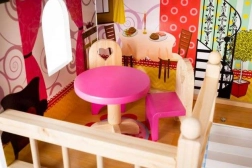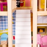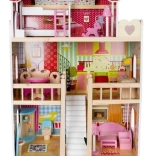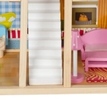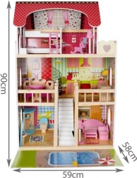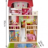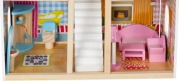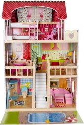 Drevený domček pre bábiky je skvelou hračkou, ktorá rozvíja kreativitu a sociálne zručnosti detí. Má tri úrovne spojené krásnymi bielymi schodmi a obsahuje celkom päť izieb, balkón a záhradu s bazénom. Je vybavený rôznymi farebnými a príjemnými prvkami, ktoré zaisťujú dlhú zábavu.