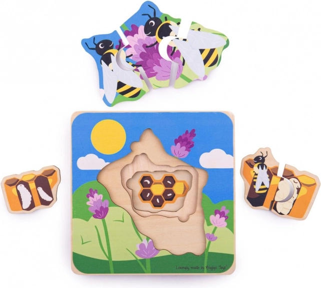 Vrstvená konštrukcia s postupne sa meniacimi obrázkami ukazuje jednotlivé fázy vývoja – od vajíčka až po dospelú včelu. Diely sú veľkosťou prispôsobené detským rukám a vďaka pevnému prevedeniu vydržia aj časté používanie.