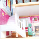 Tento elegantný trojposchodový domček pre bábiky ponúka plne vybavené izby – kuchyňu, obývaciu izbu, kúpeľňu a spálňu. Výťah, vnútorné schodisko a balkón dodávajú hre realistický rozmer. Kvalitné drevené spracovanie je odolné a bezpečné, ideálne na každodenné hranie súrodencov aj kamarátov.