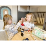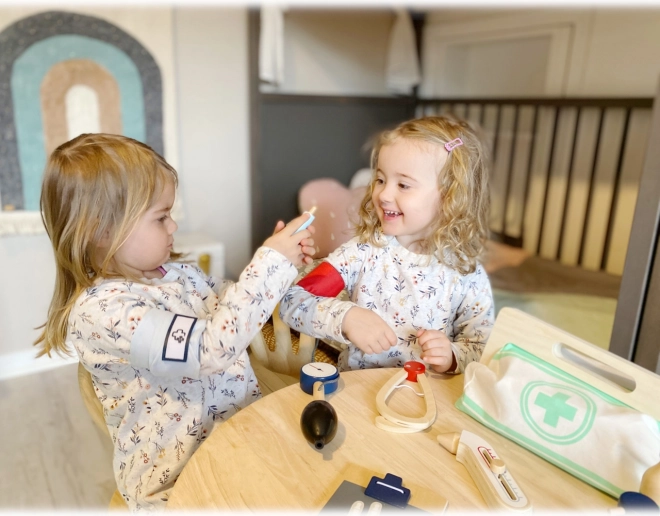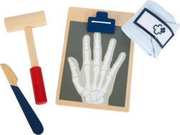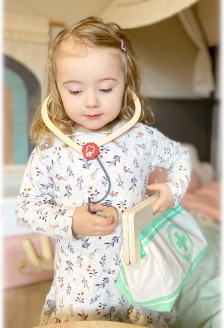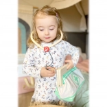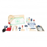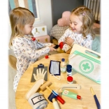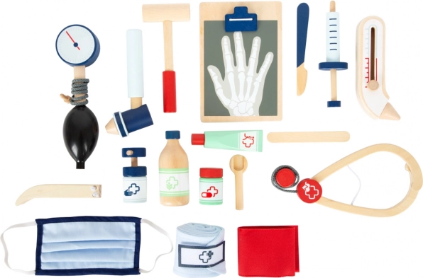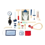 Súčasťou je bohaté príslušenstvo: stetoskop, teplomer s nastaviteľnou teplotou, injekčná striekačka s pohyblivým mechanizmom, otoskop so skutočnou lupou, ale aj tlakomer s manžetou a balónikom, dezinfekcia s pumpičkou, fľaštičky, lyžička, pinzeta, skalpel, reflexné kladivko a textilné rúška. Deti si vyskúšajú ošetrenie „pacienta“, naučia sa základom starostlivosti a odbúrajú strach z návštevy lekára.