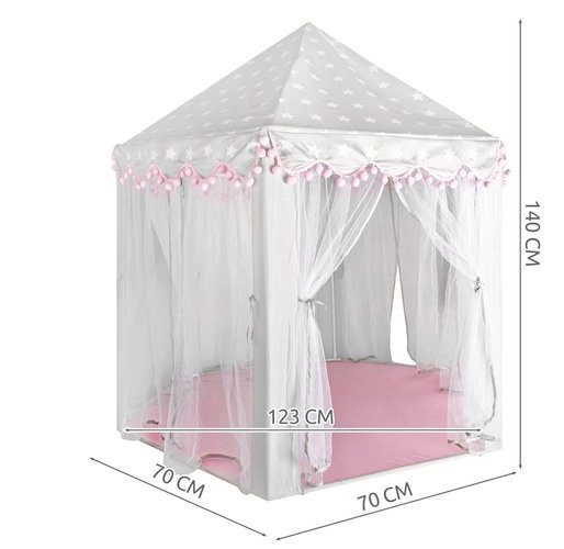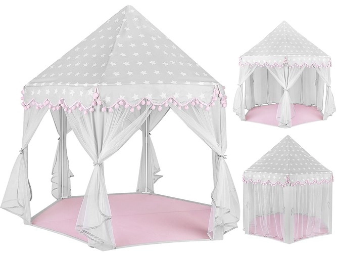 Priestranná podložka a vzdušné bočnice zabezpečia komfort pre jedno aj viac detí – zmestí sa sem veľa vankúšikov, plyšákov aj knižiek. Stan sa skvele hodí do interiéru aj na záhradu pod dohľadom dospelých. Dekoratívne pompony a možnosť zaviazania zácloniek na mašle dodajú hre šmrnc aj súkromie.