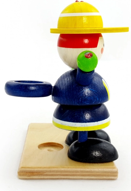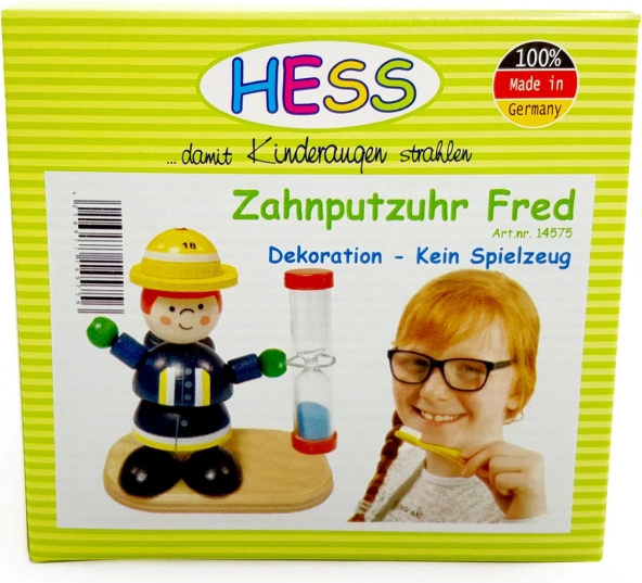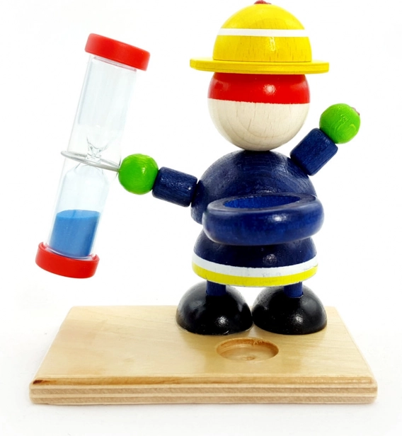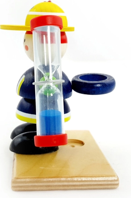 Táto farebná drevená hračka v tvare figúrky, ktorú drží hasič, je nielen dekoratívna, ale aj funkčná. Hodiny možno využiť ako originálny časovač s pieskom modrej farby, ako hravý doplnok do detskej izby. Hodiny s dĺžkou presýpania 2 minúty sú ideálne na motiváciu k čisteniu zubov.