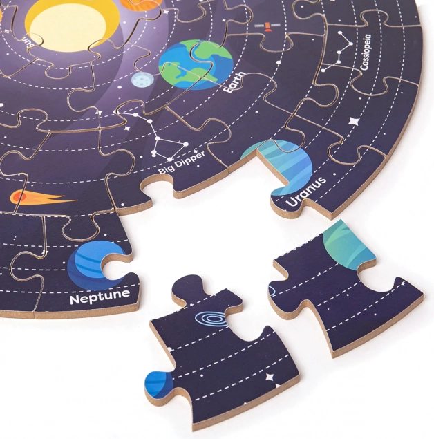 Tento produkt spája hravosť a učenie, pretože každé zostavenie dielcov rozvíja kognitívne schopnosti a znalosti o slnečnej sústave. Puzzle je vyrobené z vysoko kvalitných a zodpovedne získavaných materiálov, ktoré spĺňajú prísne európske bezpečnostné normy.