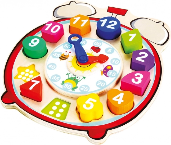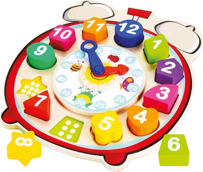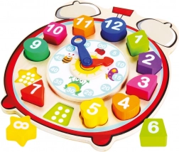 Táto multifunkčná drevená edukačná hračka spája vkladačku s hodinami. Farebné dieliky rôznych tvarov s číslami sa vkladajú do zodpovedajúcich otvorov a pod dielikmi sú vyznačené bodky pre jednoduchšiu orientáciu a prvé počty. Otočné hodinové a minútové ručičky pomáhajú deťom pochopiť princíp merania času zábavnou a názornou cestou.