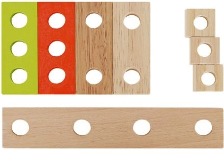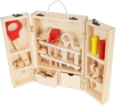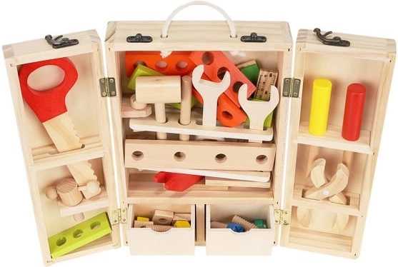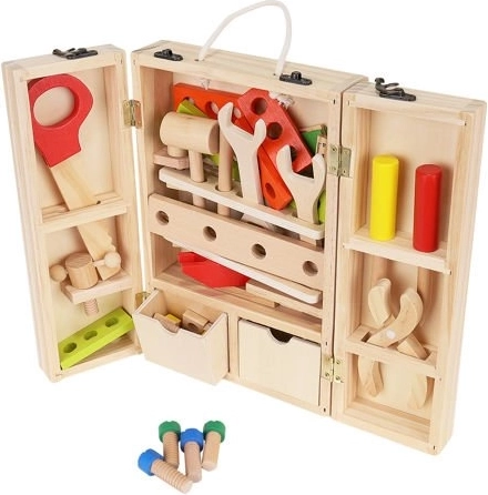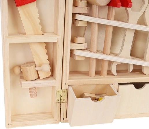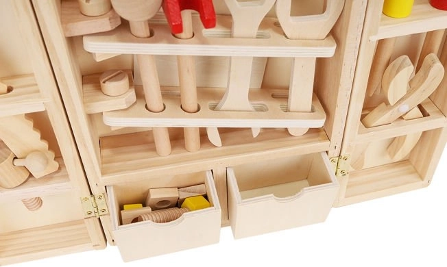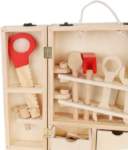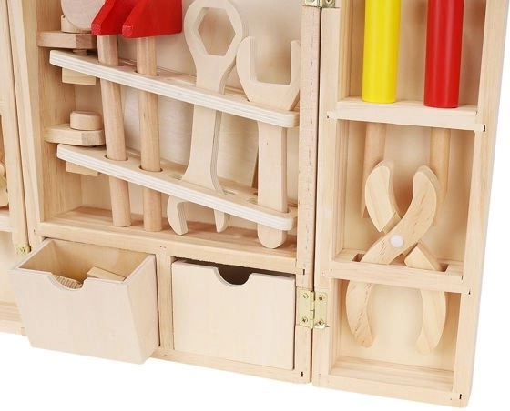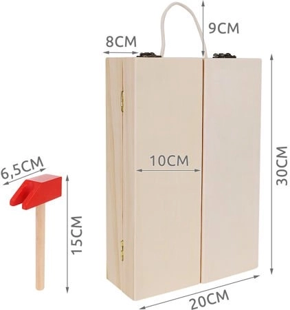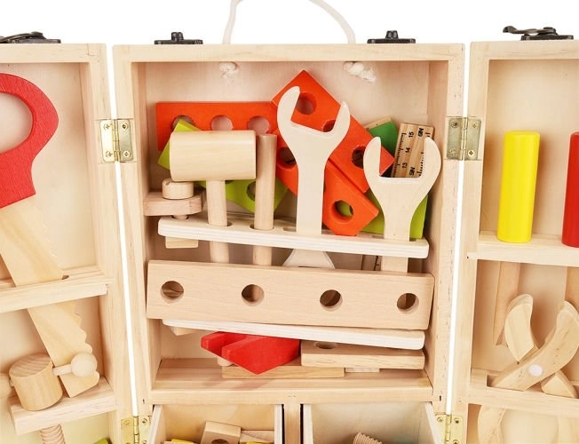 Okrem správnych nástrojov sú vo vnútri krabice aj doplnky, ako sú drevené dosky s otvormi, matice a skrutky. Zostáva v krásnych, živých farbách, priťahuje oči a vyzýva dieťa, aby sa hralo. Perfektné ako darček pre kreatívne chlapcov a dievčatá. Celok je vyrobený z prírodného dreva s dôrazom na najmenšie detaily, ktoré stimulujú detskú fantáziu od útleho veku a pomáhajú zoznámiť sa s vlastnosťami rôznych predmetov. Súpravu možno ľahko udržiavať v čistote otieraním puzdra a príslušenstva vlhkým handričkom.