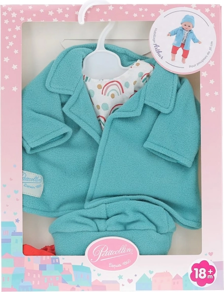 Štýlové oblečenie pre bábiku 36 cm od značky Petitcollin v dizajne Arthur: tyrkysová flísová mikina, vzorovaná blúzka, červené kraťasy a čiapočka. Kvalitné spracovanie, francúzska elegancia a pestré farby podporia fantáziu aj radosť z hry, zatiaľ čo ľahké obliekanie zvládnu aj malé ručičky.