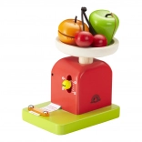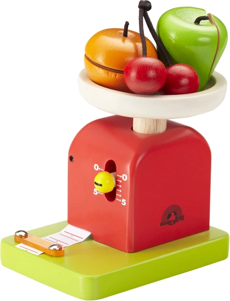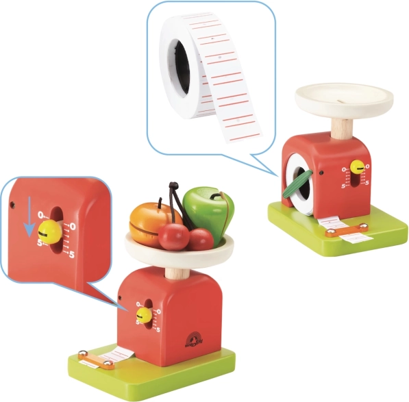 Masívna konštrukcia z masívneho dreva a kvalitný lak v pestrých farbách zabezpečujú dlhú životnosť aj bezpečné používanie. Hračka podporuje rozvoj jemnej motoriky, logického myslenia a fantázie počas hry na obchod, kuchynku či tržnicu.