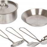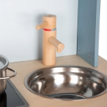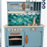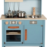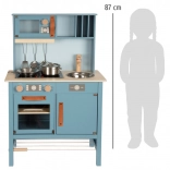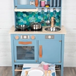 Štýlová a odolná detská drevená kuchynka v dymovo modrej farbe s koženými úchytkami. Súčasťou sady je kovové kuchynské náradie a riad, vrátane hrnca a panvice, ktoré ponúkajú realistický zážitok z varenia a organizácie.